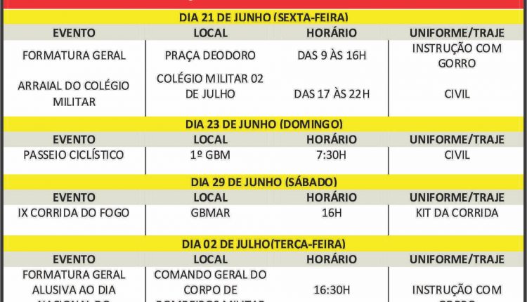 Programação da Semana do Bombeiro Institucional Por ASCOM Atualizado em 3 de abril de 2018 Compartilhar O Corpo de Bombeiros Militar do Maranhão, realizará várias atividades em comemoração ao Dia Nacional do Bombeiro. Clique abaixo em “leia mais” e veja a Programação completa da Semana do Bombeiro.