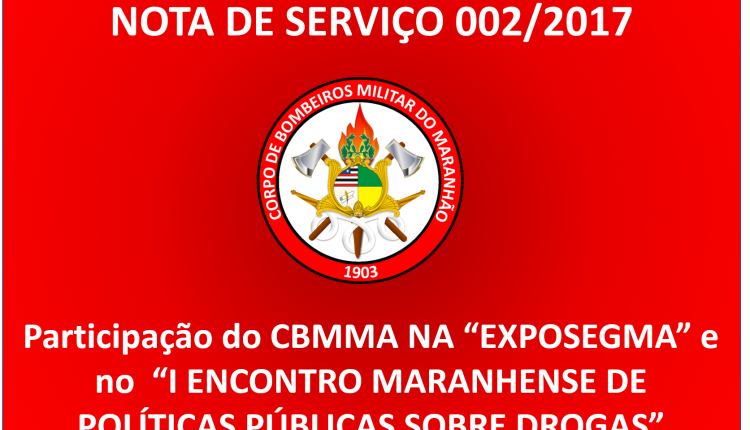 005/2017: NOTA DE SERVIÇO “EXPOSEGMA” E “I ENCONTRO MARANHENSE DE POLÍTICAS PÚBLICAS SOBRE DROGAS” AVISOSComando Geral Por ASCOM Atualizado em 3 de abril de 2018 Compartilhar
