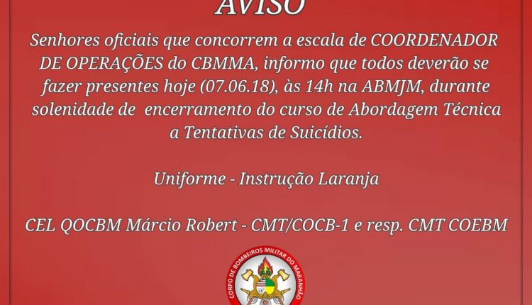 070/2018 aos senhores oficiais que concorrem a escala de coordenador de operações AVISOS Por ASCOM Publicado em 7 de junho de 2018 Compartilhar