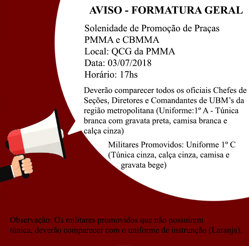 Formatura Geral Noticias Por ASCOM Publicado em 3 de julho de 2018 Compartilhar Arquivos File Date added File size Downloads Nota de Serviço nº 009 2018 - Promoção de Militares da PMMA e do CBMMA 30 de junho de 2018 10:50 am 611 KB 920