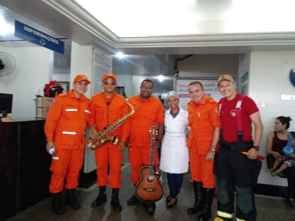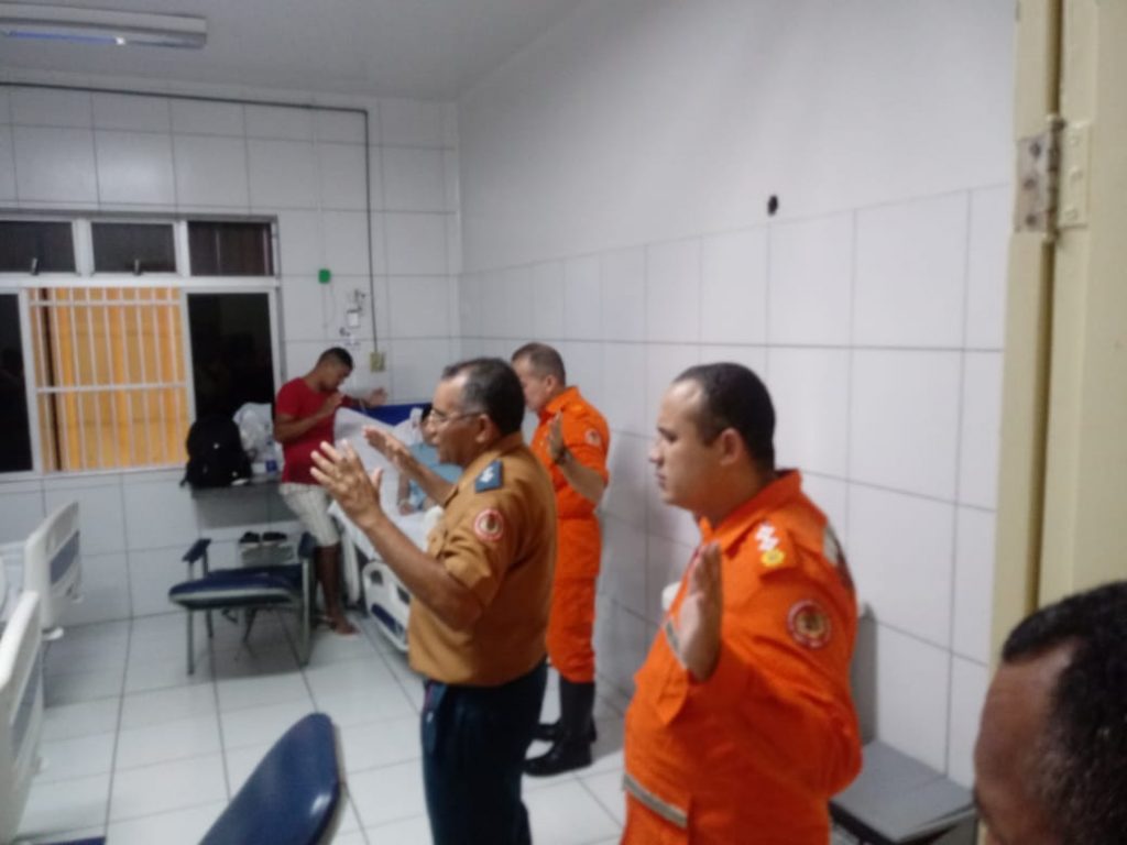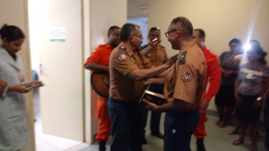 O tenente BM Rocha, o subtenente BM Cantanhede, o subtenente BM Marcelo e subtenente Eliú, missionários grupo de Bombeiros de Cristo conversaram com as pessoas nos seus leitos do hospital e levaram uma palavra carinhosa de apoio aos pacientes.