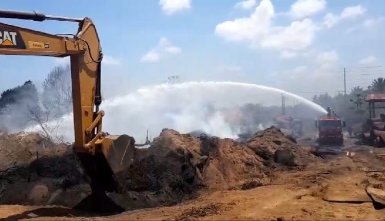 Aproximadamente de 800 unidades de rolos de esteiras de borracha e centenas de pneus foram queimados. Inicialmente a operação buscou isolar todo o material que ainda não havia sido tomado pelo fogo. Em torno de 500 rolos de borracha, o que representa mais de 200 toneladas do material foram protegidas, evitando que o prejuízo fosse ainda maior. Nesta terça-feira (17), sexto dia da operação, são empregadas retroescavadeiras para revirar o material. As máquinas também estão realizando a colocação de areia no material que ainda queima para promover a extinção do fogo por abafamento.
