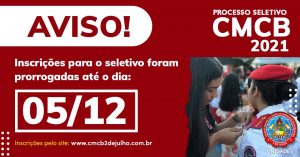 119/2020 – INSCRIÇÕES CMCB I [PRORROGAÇÃO] AVISOSUncategorized Por ASCOM-BM_ Atualizado em 28 de novembro de 2020 Compartilhar EDITAL CMCB-I 2021 – Assinado CMT-CBMMA INSCRIÇÕES PRORROGADAS PARA MAIS INFORMAÇÕES, CLIQUE NO LINK ABAIXO https://www.cmcb2dejulho.com.br