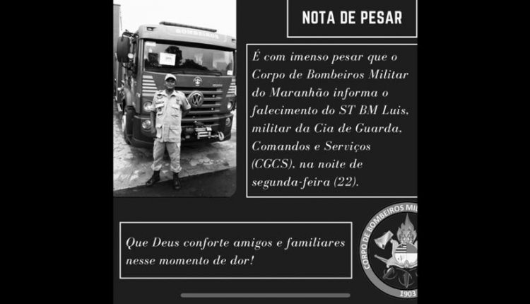 NOTA DE PESAR NoticiasUBM's Por ASCOM-BM¬ Atualizado em 23 de março de 2021 Compartilhar É com imenso pesar que o corpo de Bombeiros Militar do Maranhão informa o falecimento do ST BM Luis, militar da Cia de Guarda, Comandos e Serviços (CGCS), na noite de segunda-feira (22). Que Deus conforte amigos e familiares nesse momento de dor!