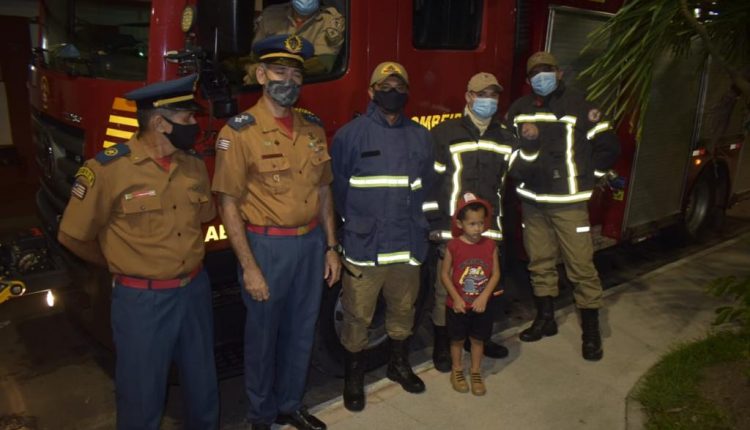 Na última terça feira (06), Carlos Gustavo, aniversariante do dia, completou 3 anos e, além de ser super apaixonado pela corporação, tem o sonho de ser um bombeiro militar quando crescer. O garoto queria como presente de aniversário a presença de um carro de bombeiro e teve seu desejo realizado. Uma guarnição do 2° Batalhão de Bombeiro Militar (2º BBM) composta pelo 1° Tenente Rone, 1° Tenente Everaldo, ST James, Sargento A José, Sargento Magno e Soldado Régis, visitou o aniversariante e além de realizar esse desejo também o presenteou com uma camisa personalizada e apresentou toda a viatura.