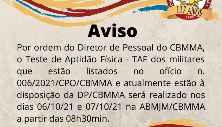 98/2021 AVISO DE APLICAÇÃO DO TESTE DE APTIDÃO FÍSICA (TAF) AVISOS Por ASCOM-BM3 Atualizado em 21 de setembro de 2021 Compartilhar