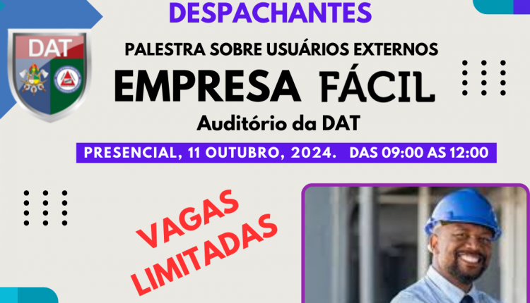 A Diretoria de Atividades Técnicas do Corpo de Bombeiros Militar do Maranhão, com o Governo do Estado do Maranhão e a Junta Comercial do Estado do Maranhão (JUCEMA), realizara PALESTRA SOBRE USUÁRIOS EXTERNOS DO SISTEMA EMPRESA FÁCIL, e convida os responsáveis técnicos e despachantes este evento que será realizado no dia 11 de outubro de 2024, das 9h as 12h.