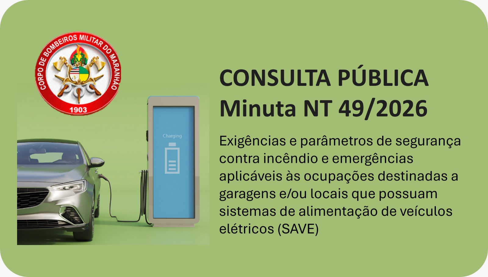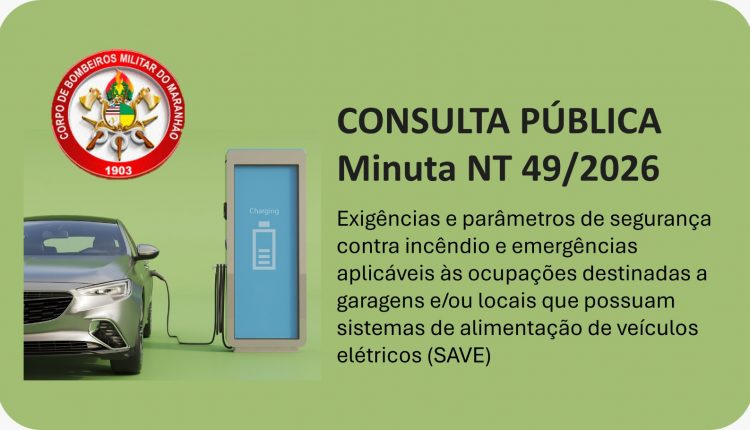 O Corpo de Bombeiros Militar do Maranhão (CBMMA) disponibilizou para consulta pública a minuta da Norma Técnica nº 49/2026. O documento estabelece as exigências e parâmetros de segurança contra incêndio e emergências em garagens e locais que possuam Sistemas de Alimentação de Veículos Elétricos (SAVE).