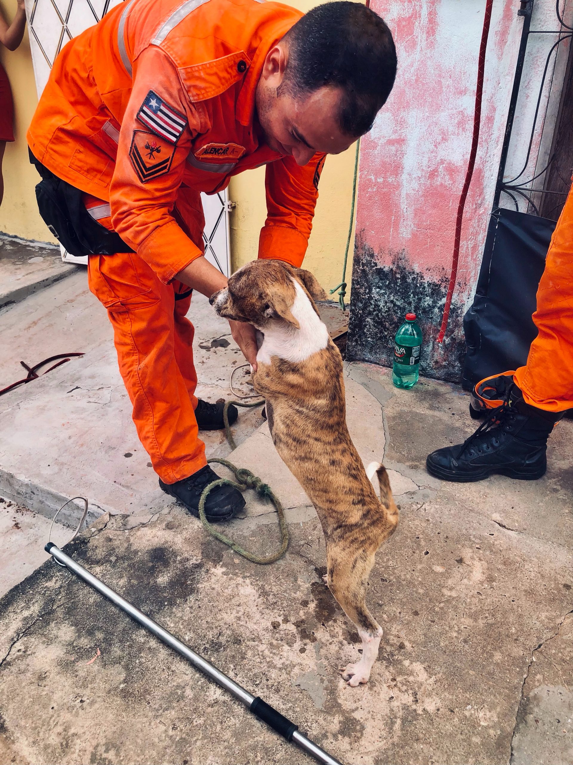 Os moradores decidiram acionar o Corpo de Bombeiros depois que ouviram os choros da cadela de rua durante a noite. Após o resgate, o animal foi hidratado e passa bem.