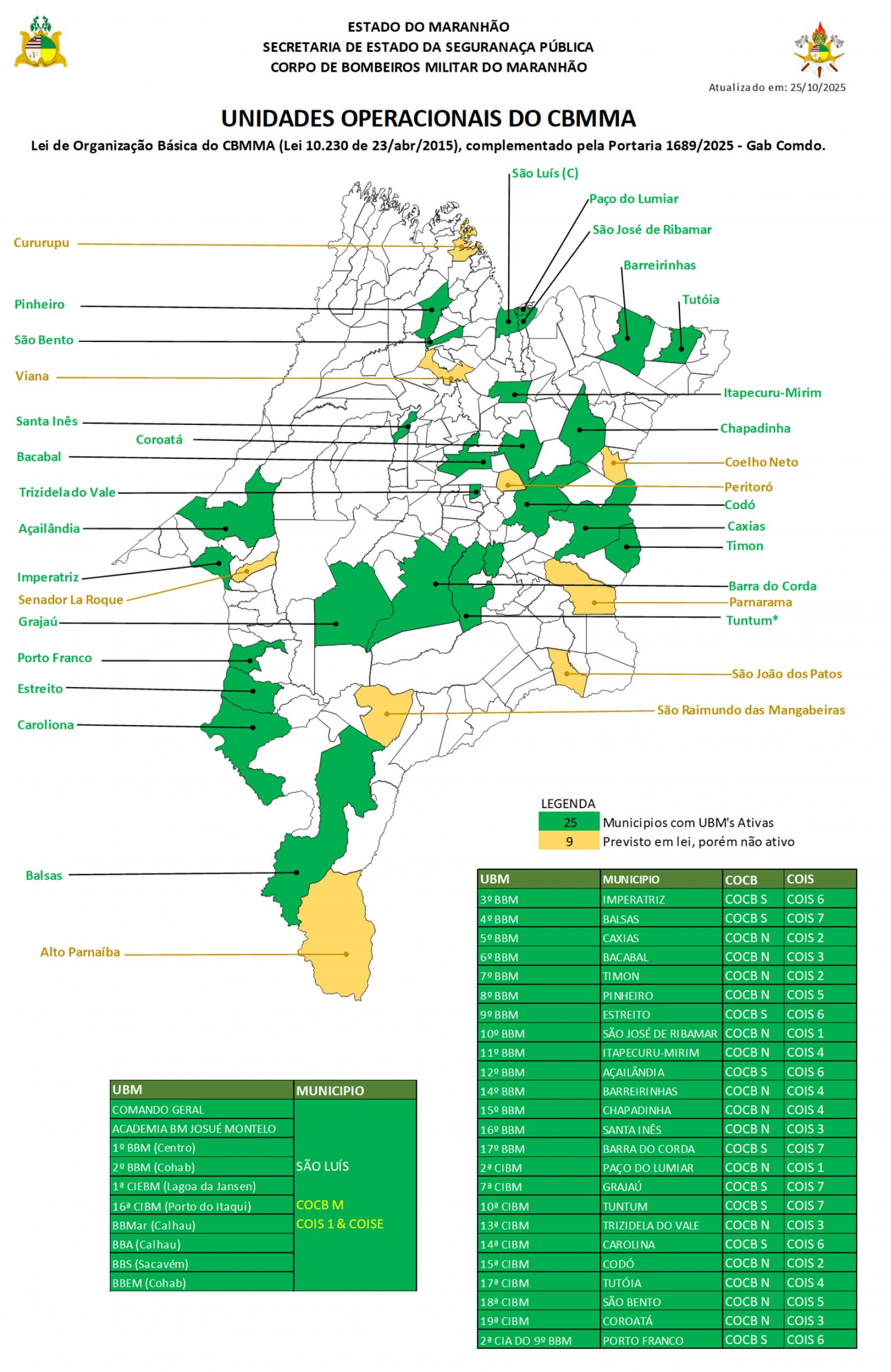 UNIDADES BOMBEIRO MILITAR NO ESTADO (Lei 10.230 de 23/abr/2015, Lei 10.939, de 23/out/2018 e Portaria 28/2022 - Gab Comdo.)